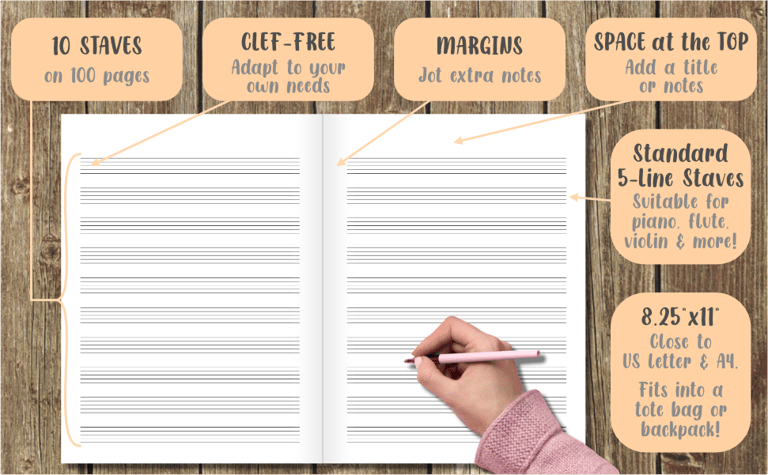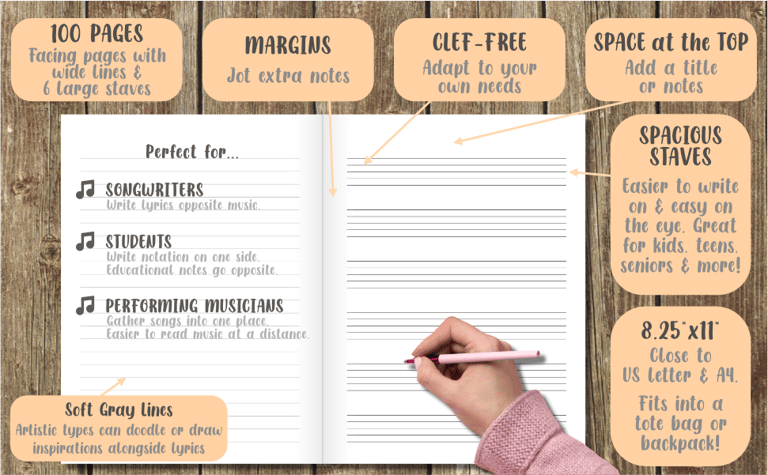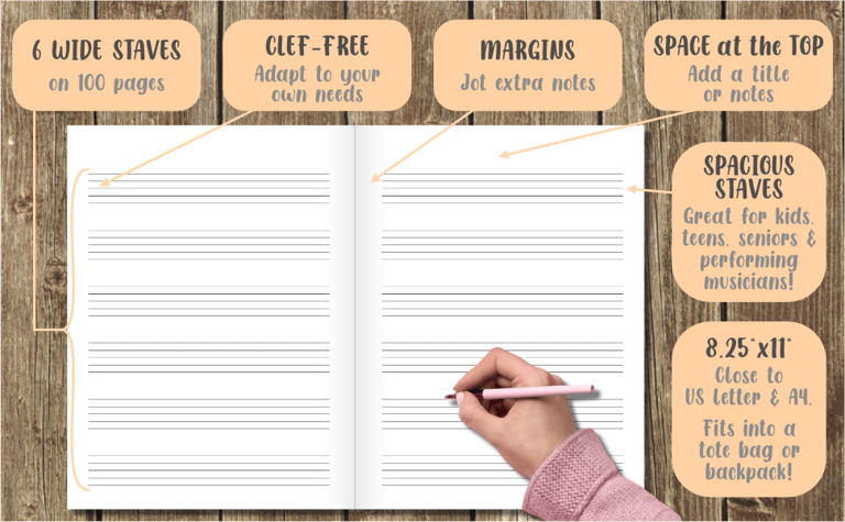 100 pages ~ Facing Pages with Wide Lines & 6 Large Staves